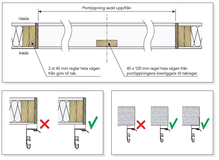 Vid nybygge med regelkonstruktion kan du använda två väl sammanfogade 45 mm stående reglar på varje sida av portöppningen som lämplig infästning av väggskenorna. Reglarna måste gå hela vägen från golv till tak. Har du en gjuten eller murad vägg är det lämpligt att fästa en stålprofil med lämpligt mått runt portöppningen.