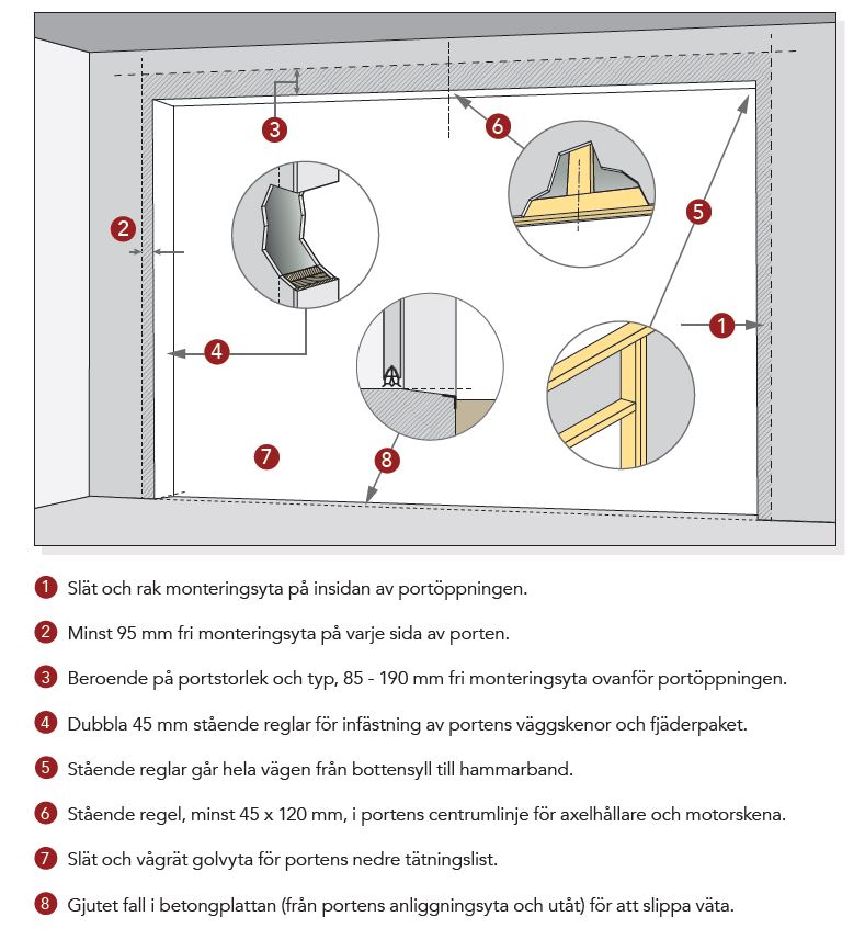 Kontrollera att alla byggnadsdelar runt portöppningen är väl förankrade i huskroppen. Porten har hög egenvikt och genererar stora krafter vid öppning och stängning!