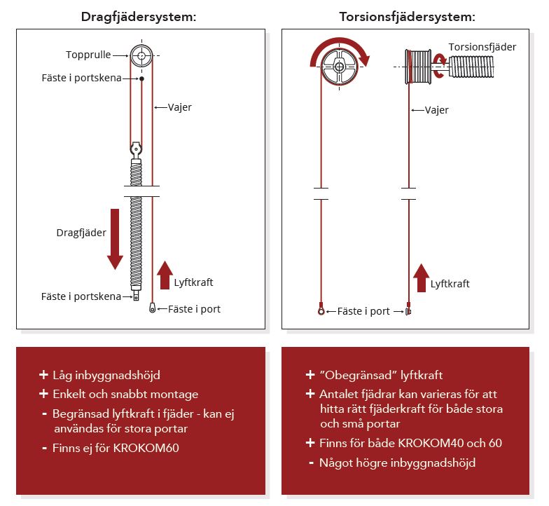 En takskjutport är försedd med ett lyftsystem med endera drag- eller torsionsfjädrar. Fjädersystemet bär portens huvudsakliga vikt så att den lätt kan öppnas manuellt eller med en motordriven garageportsöppnare. Vilket fjädersystem du ska välja beror framför allt på portstorlek, fri takhöjd ovanför portöppningen och isoleringstjocklek.